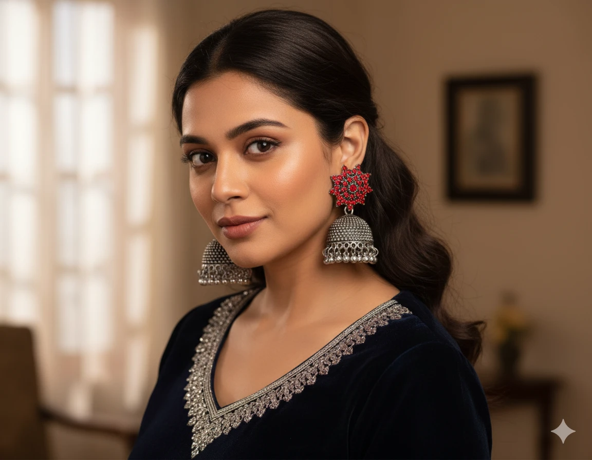 Command attention with these stunning Regal Red Enamel Jhumka Earrings. The classic jhumka design is elevated by a deep, midnight red enamel finish beautifully contrasted with an oxidised silver-look metal. This striking combination of colors and textures creates a powerful, traditional look perfect for major events, wedding ceremonies, or adding a rich pop of color to any ethnic attire.