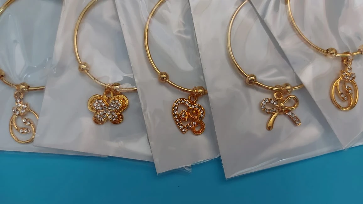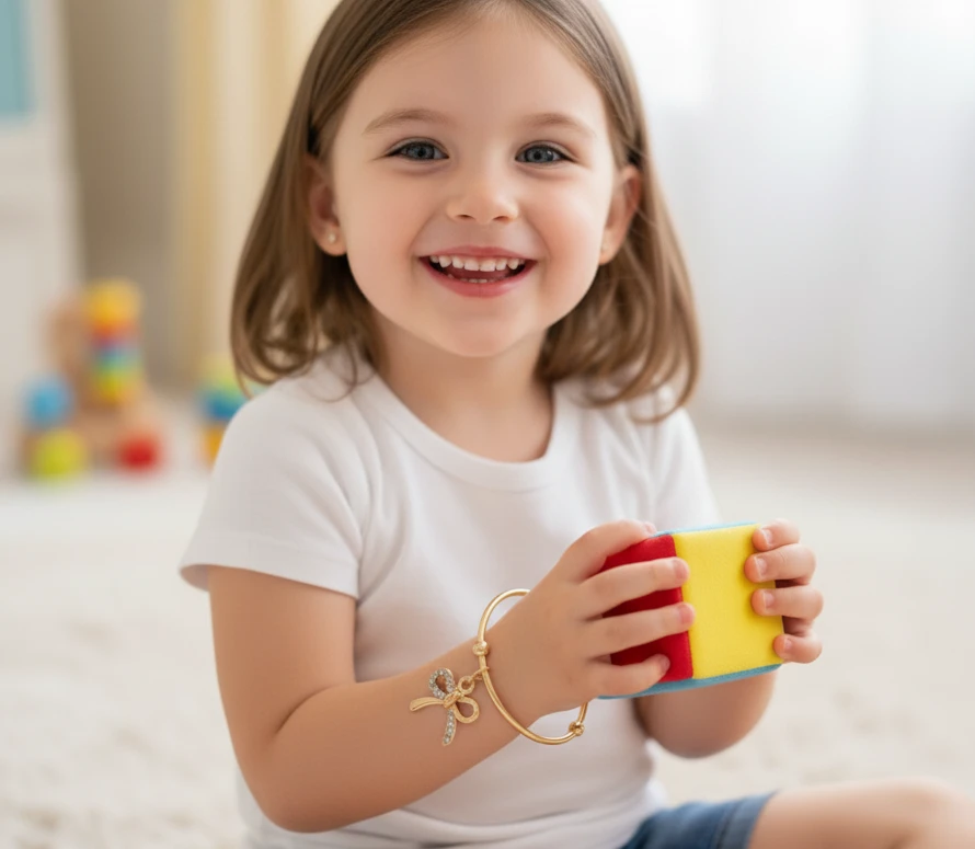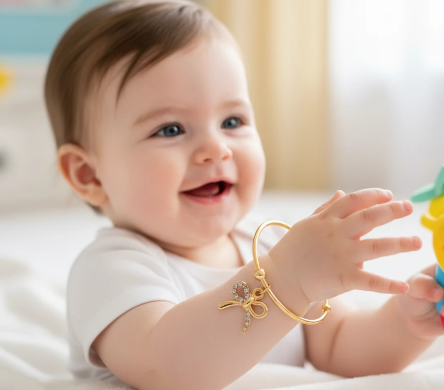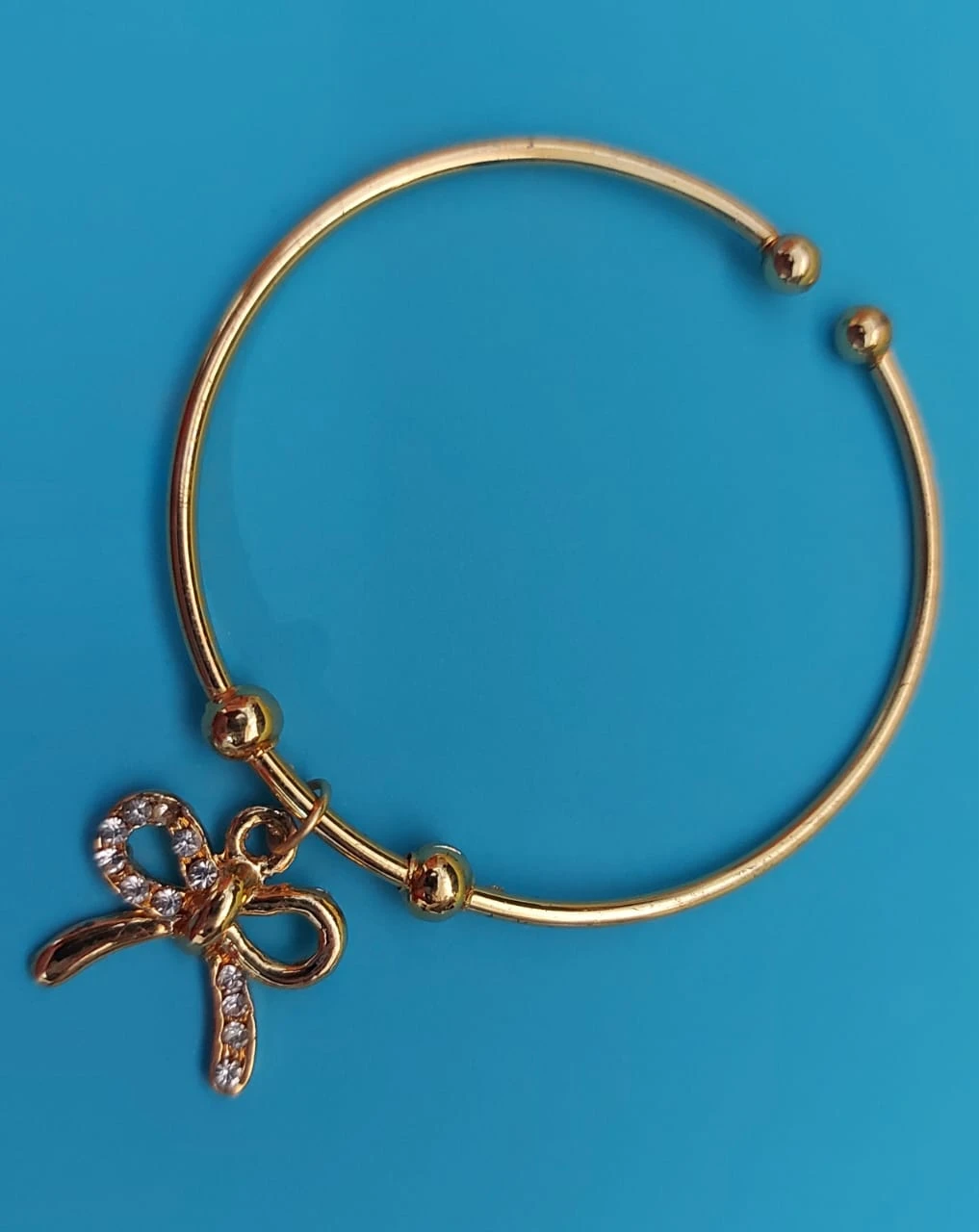 Celebrate a little one with this charming and safe adjustable baby bangle. Crafted in a high-shine gold-tone finish, the simple cuff design allows for easy wear and removal while ensuring a comfortable fit as the baby grows. The centerpiece is a delightful bow-shaped charm, elegantly encrusted with sparkling clear crystals, adding a touch of timeless glamour. This bangle is a beautiful keepsake, making it an ideal first piece of jewelry for a newborn, infant, or toddler. Care Instructions: Gently wipe clean; avoid prolonged exposure to water and chemicals.